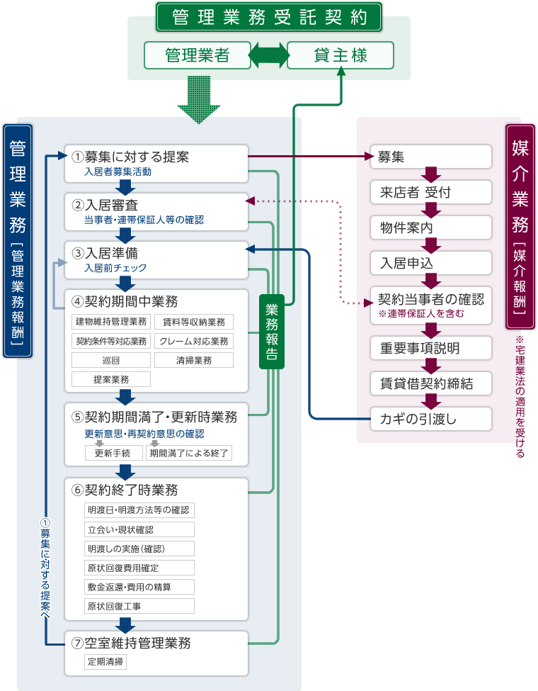 ①すべておまかせ管理システム(「賃貸不動産管理システムの流れ」フローチャートの①~⑦の全て)